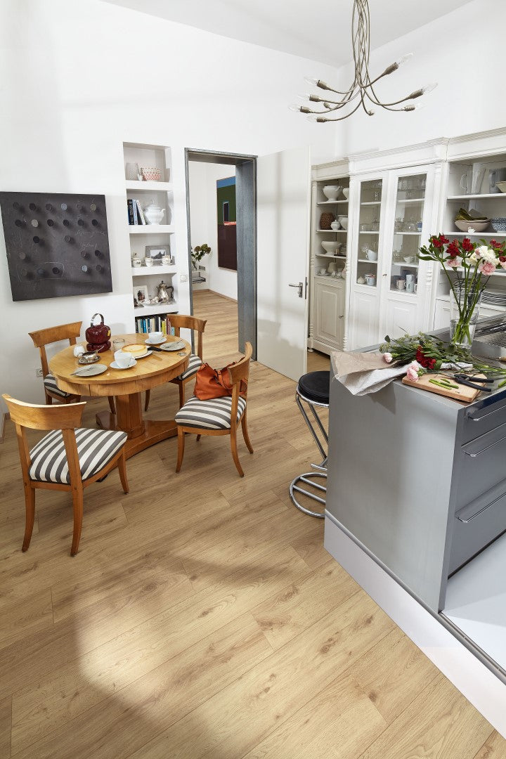 Antistatisch, wasserresistent und absolut kratzunempfindlich: MeisterDesign. laminate LD 150 ist der clevere Laminatboden für alle Anwendungen. Mit seiner Aufbauhöhe von 8 mm und der Nutzungsklasse 23 | 32 eignet er sich für stark genutzte Wohnbereiche genauso wie für Badezimmer oder gewerbliche Bereiche wie Boutiquen und Restaurants. Die Kurzdiele (1288 x 198 mm) verfügt als besonderes optisches Detail über eine feine Microfuge, die die einzelnen Dielen in der Fläche leicht voneinander abhebt und so den Boden besonders plastisch wirken lässt.